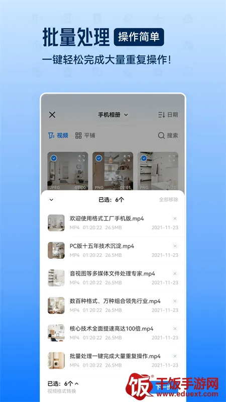 支持批量处理:支持视频格式批量转换、视频批量压缩、视频批量提取mp3,高效便捷。