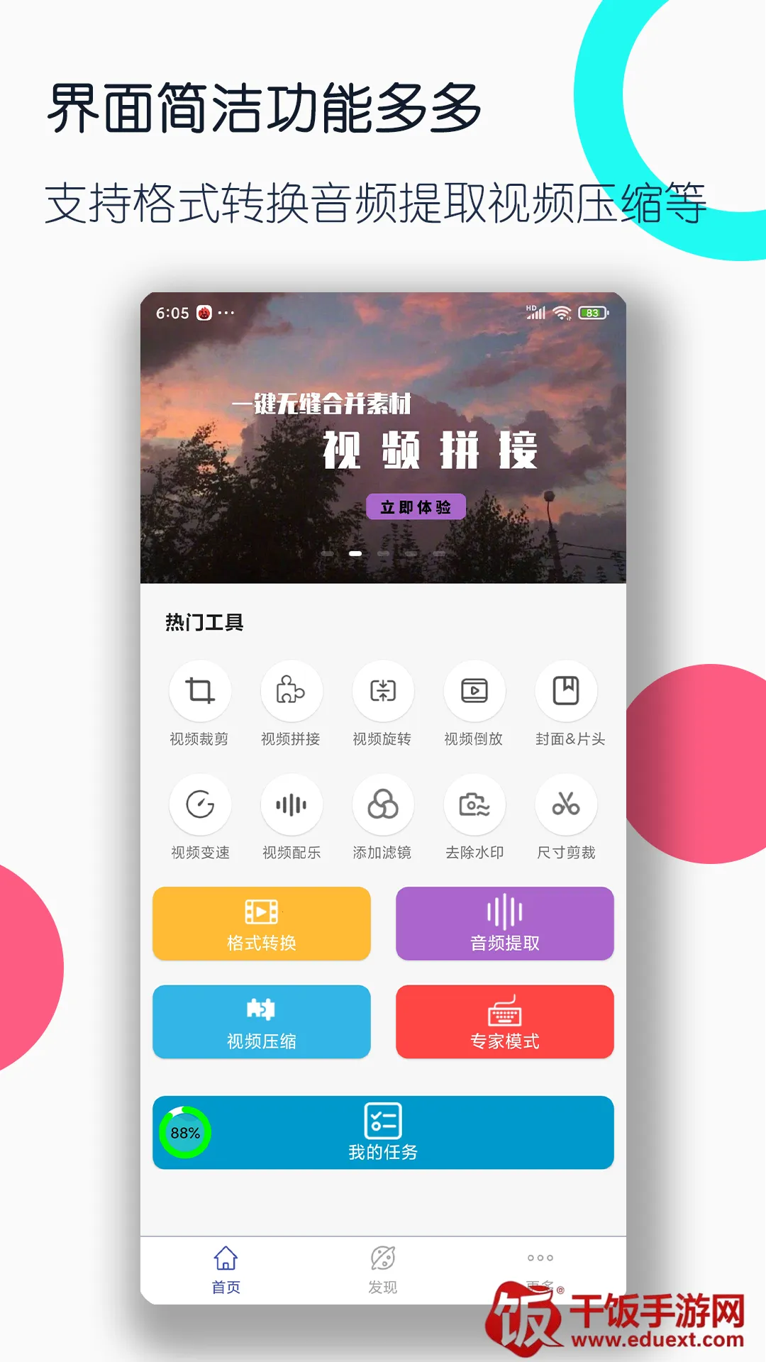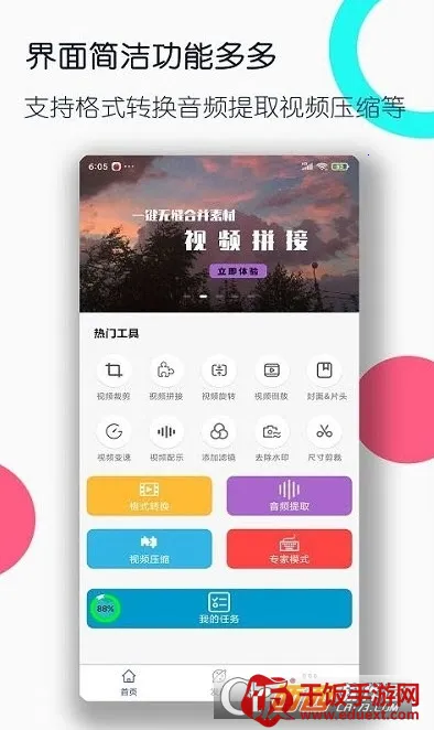 如果你想转换视频格式,全能格式转换工厂绝对是个好帮手!它能帮你轻松实现视频格式转换,让手机也能观看各种格式的视频。这款软件支持十多种格式之间的转换,像mov、amv、mp4等,满足你转换视频格式的需求。它还有各种解压转码能力,功能超强大!在转换过程中,能自动修复损坏的视频文件,成功完成视频输出。使用起来也很方便,下载安装好手机版后,运行软件,首页就有视频裁剪、音频剪辑、视频拼接等多种功能。点开剪辑,能拍摄视频或图片并进行剪辑;在发现栏,有视频转码、剪切、添加水印等几十种功能。它还支持视频转音频,一键就能把视频转换为MP3文件。有了全能格式转换工厂,视频格式转换轻松搞定,超实用!