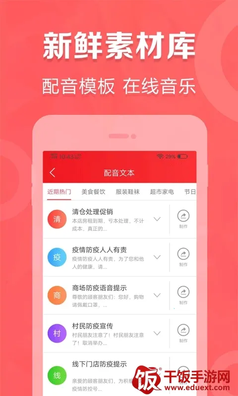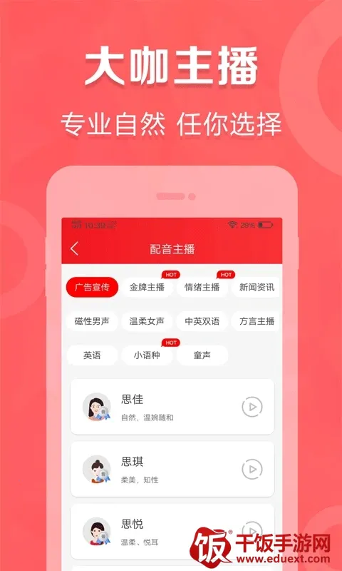 叫卖广告录音2025最新版本是一款文字转语音合成配音软件,运用智能AI拟人技术,将文本转化为真人语音。有多种主播音色,覆盖多场景,提供丰富背景音乐和文本模板,操作便捷,能打造优质配音体验。