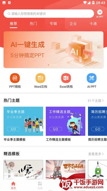 1、拥有丰富多样的模板类型,包括ppt演示幻灯片模板、word文档模板、excel表格模板等,一键点击即可套用,制作各种文档更加便捷。