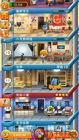 玩法丰富多样,可自由规划大楼各层功能,通过住宅、商铺和活动赚钱,还能体验完整的商铺上下管理,销售更多产品获取金币。
