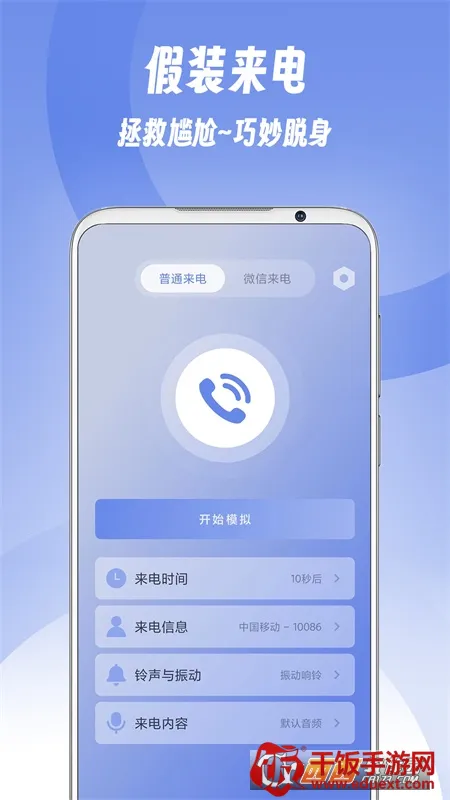 假装来电2025官方正版是一款可模拟来电的工具,能设置来电时间、名称、铃声及内容,支持微信来电。提供真实模拟体验,自由设置参数,无需注册账号,支持来电语音外放,全方位模拟助你推脱不喜欢的聚会。