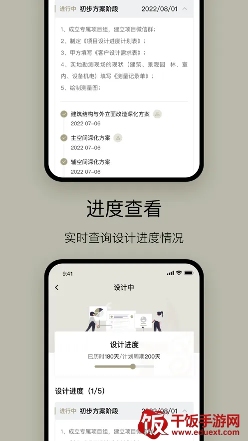 2. 全流程进度可视:5大施工阶段36个节点全程可视化,实时更新施工节点,支持图文视频汇报,让您随时随地掌握工地进展,装修过程放心无忧。