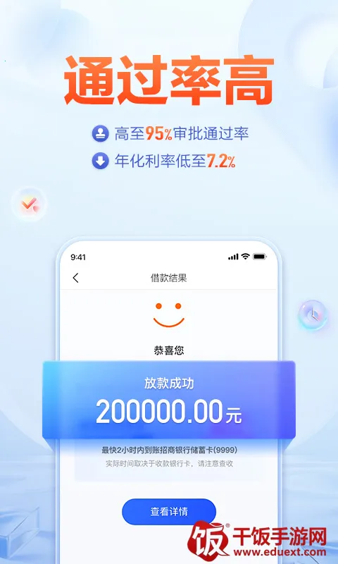 2、审批快:仅需三步申请,凭借人工智能和大数据风控,实现快速审批,1分钟即可放款。