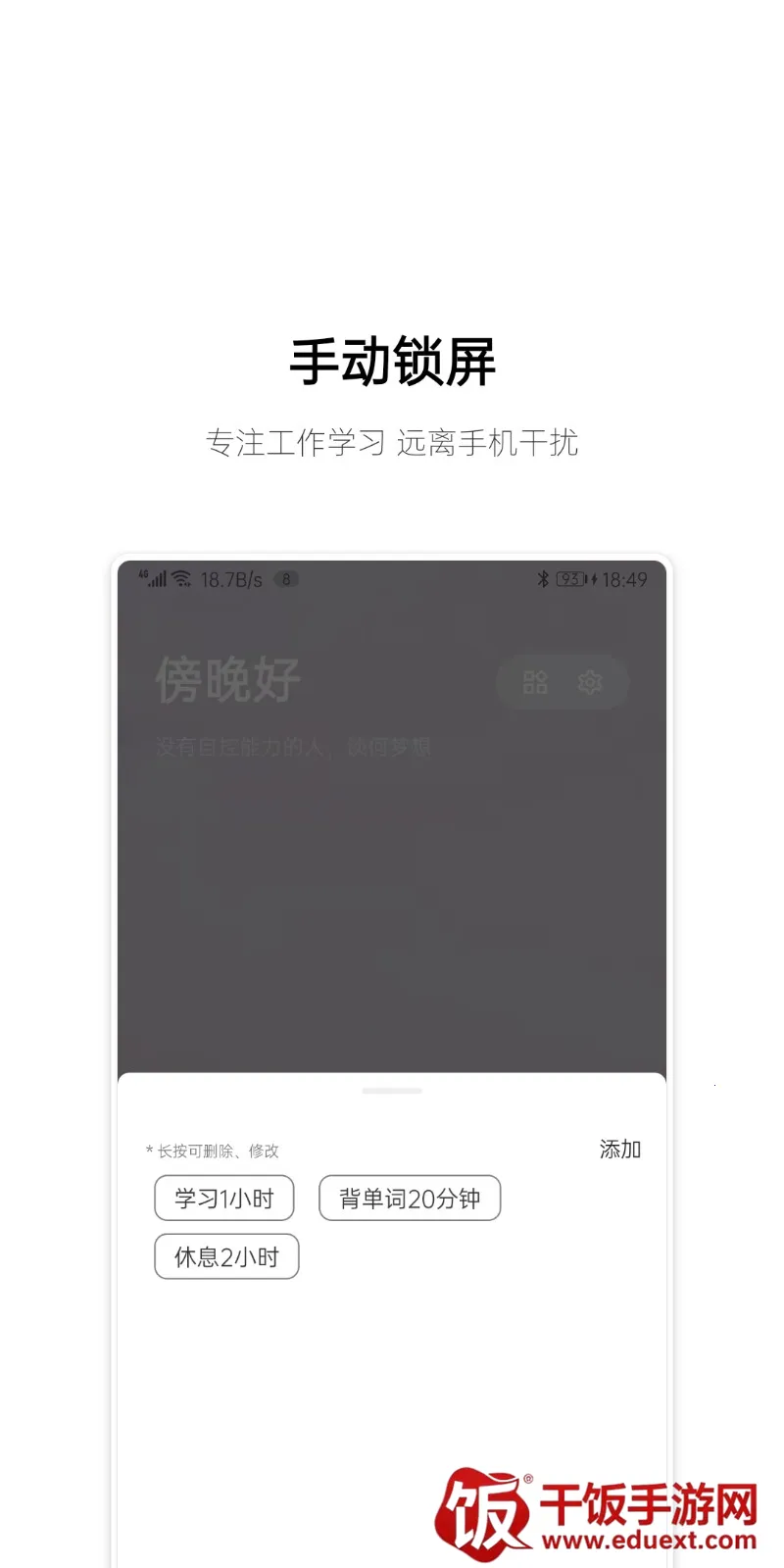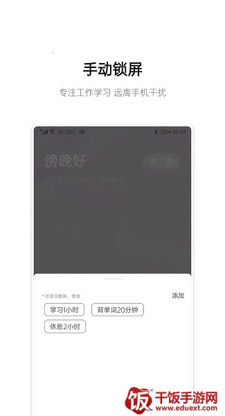 1、提升自律能力:内置专注锁机、定时锁机等功能,可强制提醒放下手机,帮助用户逐步摆脱拖延和熬夜困境,提升自律能力。