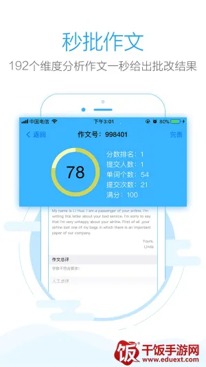 句酷批改网是服务师生的英语作业批改软件。能自动识别批改作业,减轻教师负担。有海量题库、教学资源,可检测抄袭,生成报告。还提供交流平台,方便获取资源、提问,全方位提升英语知识。