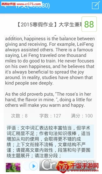 句酷批改网是一款超棒的学习软件,能极大满足师生需求。它能在线批改作业,自动识别学生答案,快速给出分数,大大减轻教师批改负担。亮点多多,能快速精准识别英语作文词汇语法错误,涵盖听说读写各类教学资源提升学生英语技能。特色鲜明,可检测抄袭,有丰富历年真题助学生复习,还能根据学习进度自动生成报告。它为师生提供交流平台,方便学生在线提问。使用时,若没账号先注册,学生选注册学生账号,填好信息登录,完善资料。进入首页,可凭作文号找作业,也能添加老师查看作业。截止日期前完成答题就行,超方便。有了句酷批改网,学习更轻松高效,是提升英语知识的得力助手,赶紧登录体验吧!