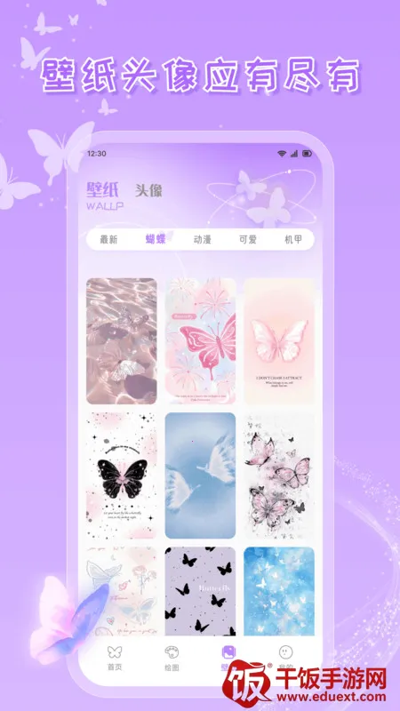 蝴蝶壁画安卓版是一款集海量壁纸、头像及绘画功能于一体的app。能自由创作蝴蝶壁纸,有多种绘画工具,资源免费下载,适配多机型,界面简洁,分类清晰,满足多样需求。