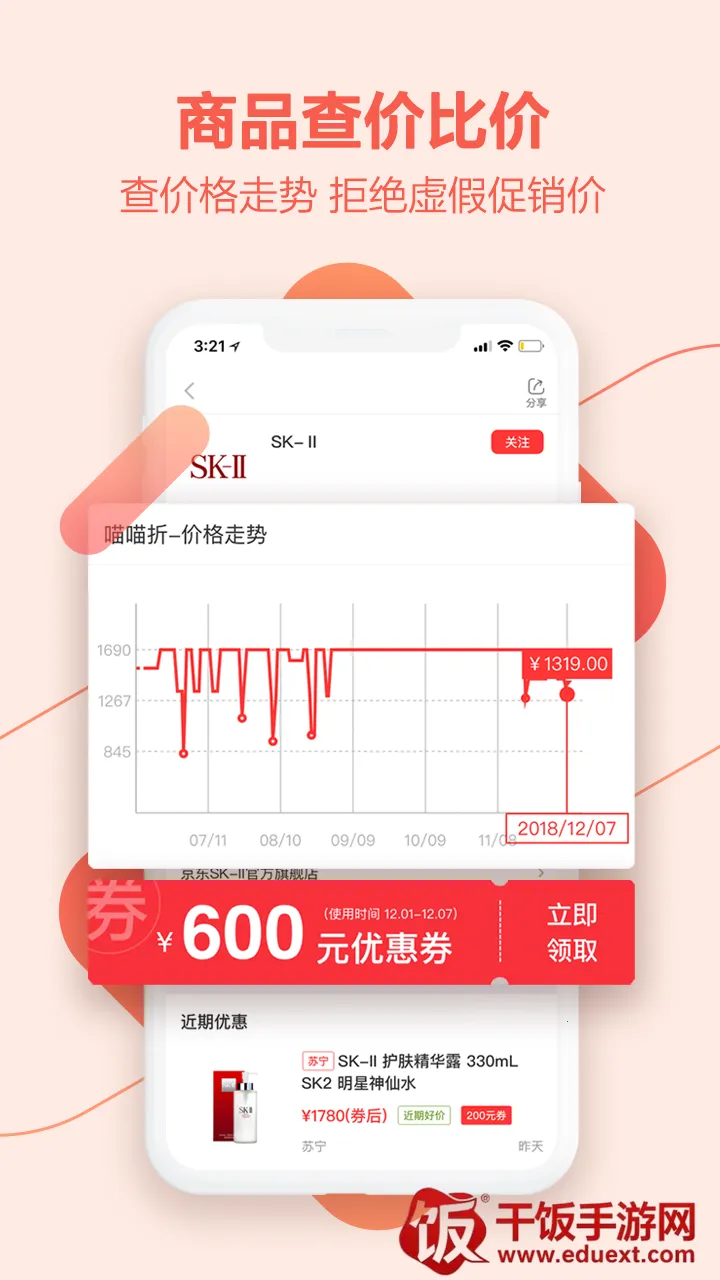3、降价提醒不错过:系统借助大数据追踪商品价格,商品降价时会提醒用户,助其以超低价格买到心仪商品。