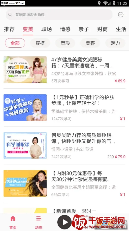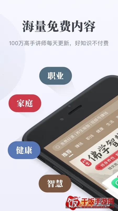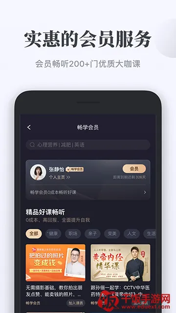 1. 海量精品课程:涵盖母婴亲子、健康医学、养生变美、情感家庭、职场财经等多个类目,20万课程任你选,每个类目下还有10000的精华内容,1000各种主题优质直播间,每天更新,想学的都能找到。