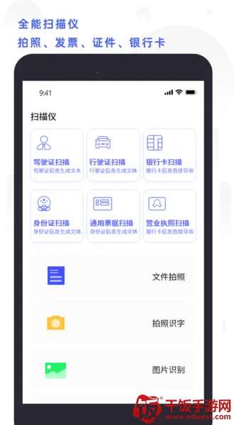 3. 证件扫描全:支持驾驶证、行驶证、银行卡、身份证等多种证件类型的扫描,并能转化识别文本,提供便捷的证件信息录入体验。