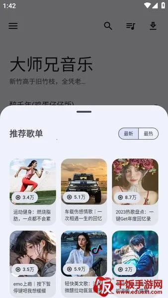 大师兄音乐是一款出色的音乐播放软件。它无需注册登录,打开就能免费听全网音乐,支持在线播放、榜单推荐、歌词同步、无损下载及歌单导入等功能。页面简洁无多余内容,无论想听什么歌都能搜到,还支持高质量无损音源文件下载。其音乐推荐能帮你发现好歌,搜索功能快速高效,能精准找到想听的。有多种音乐音质可选,畅享高质量免费音乐。海量音乐资源实时更新,各类风格题材全覆盖,满足你随时随地听音乐的需求,给你带来极致的音乐享受。