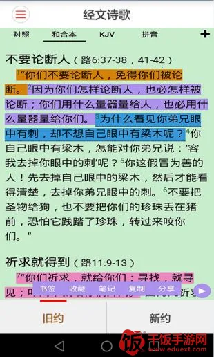 精读圣经2026官方正版是一款专为圣经阅读设计的手机软件。它提供了完整的中文版圣经内容,更有多种阅读工具,能让读者在阅读时复制文本、高亮标记,让阅读变得更加方便。贴心的双语对照翻译功能,能够为读者同时展示圣经原文和翻译内容,方便读者进行对比。可自定义的圣经阅读界面,字体大小、阅读背景等都能自定义,更好地优化了读者的阅读体验。