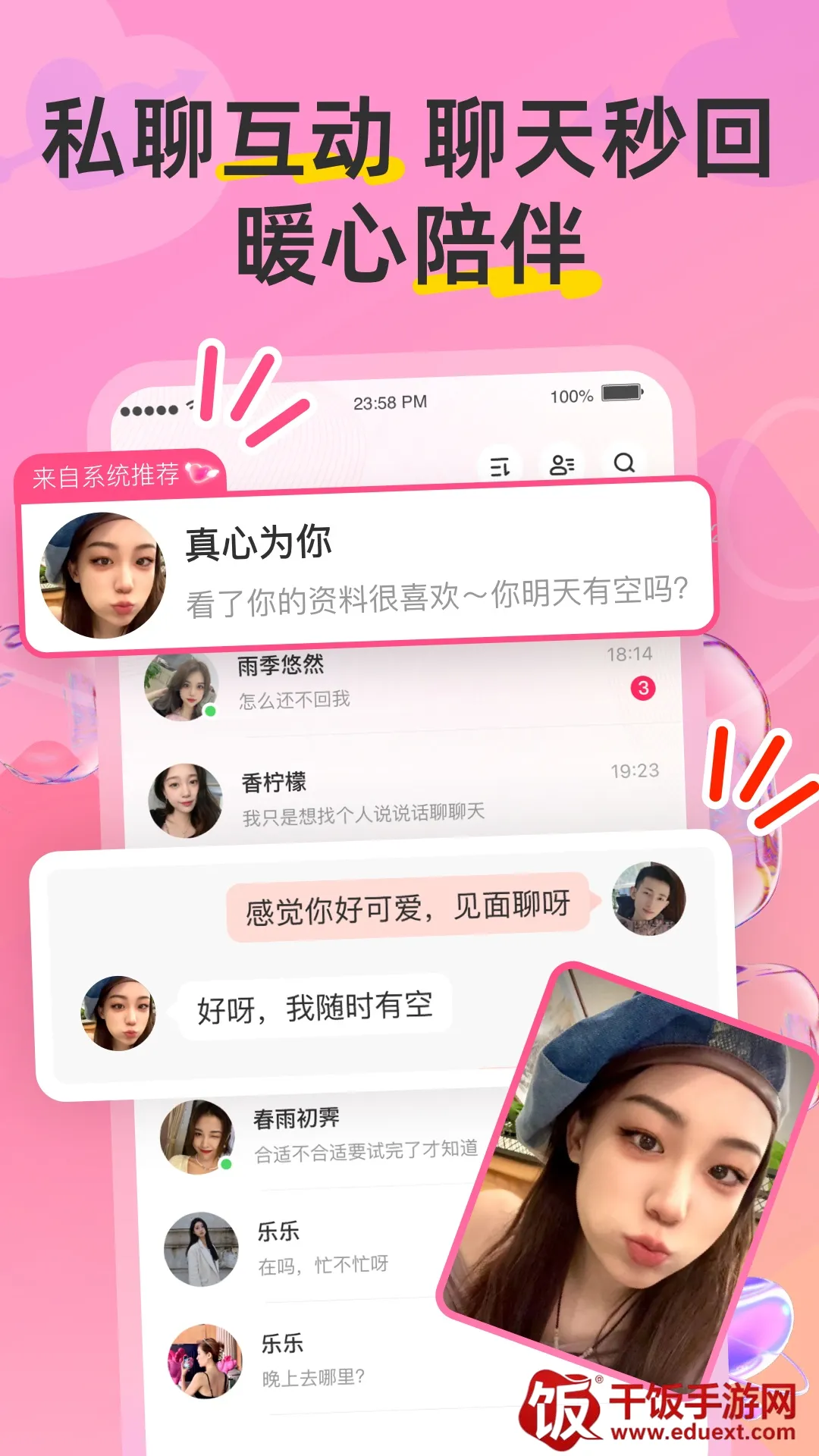 1、智能匹配精准高效:根据用户年龄、兴趣、性格和地理位置,智能推荐合适交友对象,全天24小时都有用户在线,快速高效满足精挑细选,大大提升社交效率。