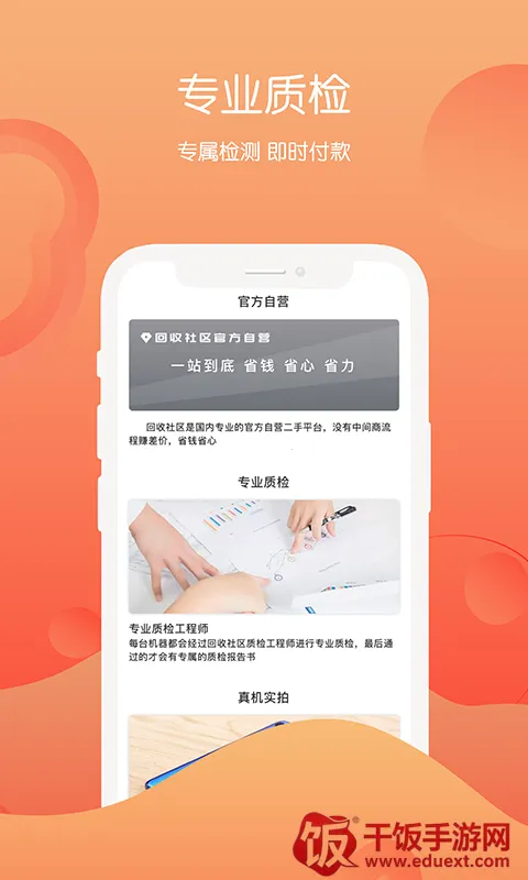 回收社区安卓版手机版核心特色突出。**专业检测**是一大亮点,所有回收产品经70余项专业检测,官方工程师全程把关,杜绝翻新暗病水货,品质有保障。**高价回收**,承诺高价且公开扣减,价比多家。**顺丰包邮**全国免费上门取件,便捷无忧。**快速收款**,收货当日质检,确认回收当天付款秒到账。还有官方平台担保交易免手续费,提供多样回收方式助力节能环保,涵盖多种3C产品,7天退换180天质保,让二手数码交易放心无忧。