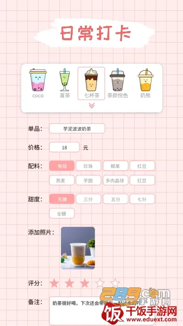 吨吨奶茶App专为奶茶爱好者打造,能详细记录奶茶口味配料与体验,统计摄入量。有勋章激励打卡,支持社区互动交流、一键分享。还能帮想戒奶茶的人监督自己,掌握购买制作技巧,避免踩雷。