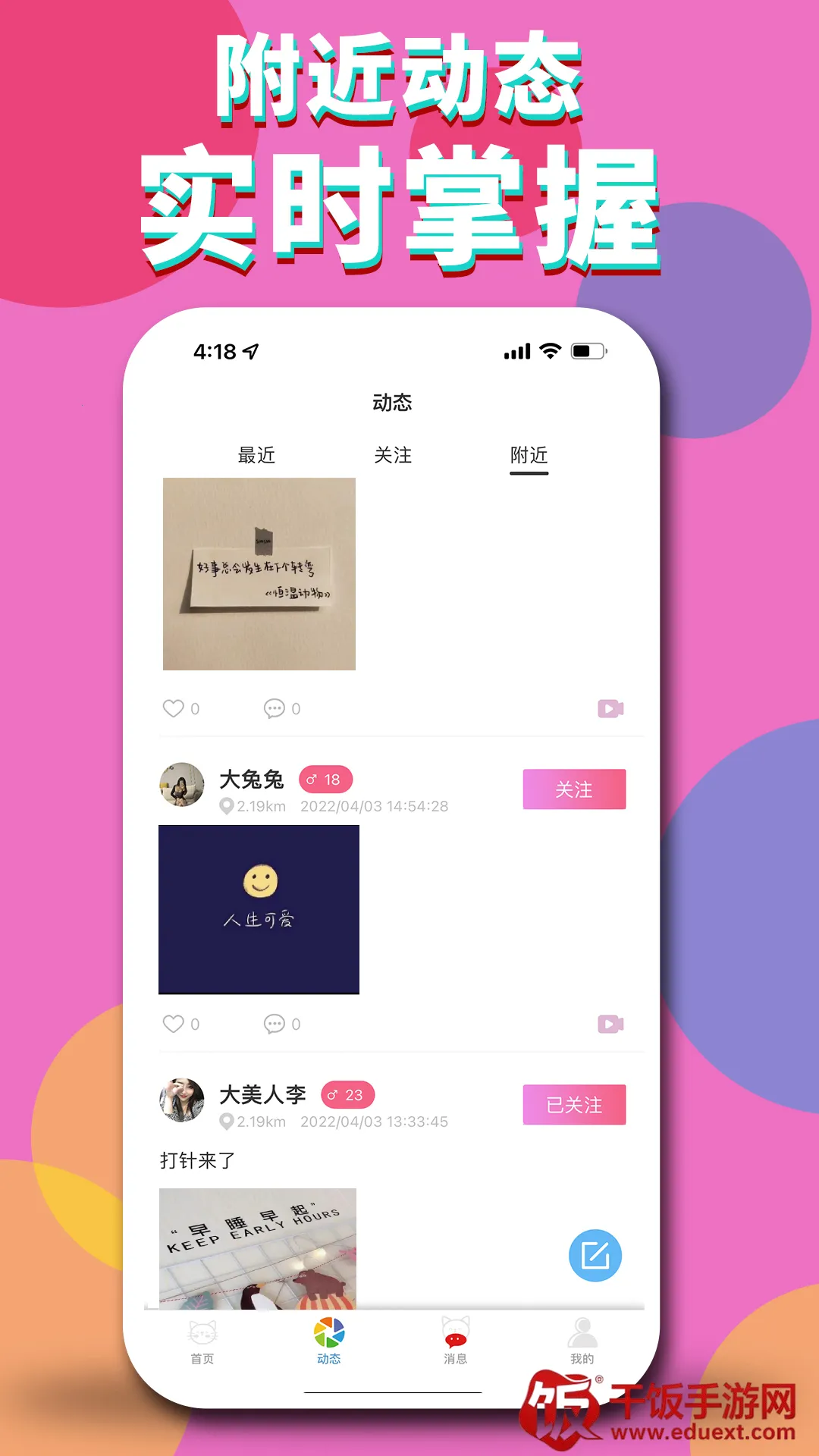 2、附近交友:附近陌生好友探寻密聊,附近好友随时约见,让你的交友充满别样情趣,快乐约单,告别单身更容易。