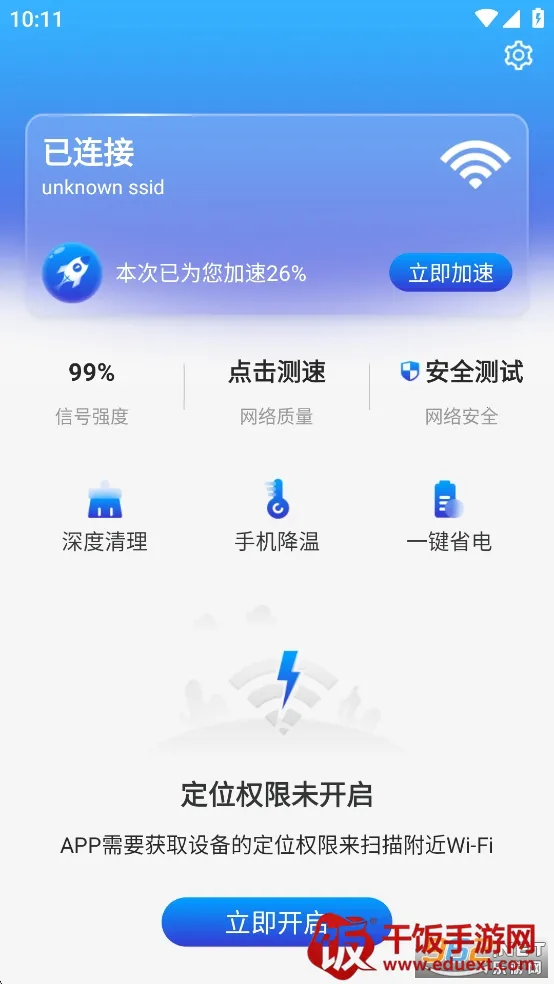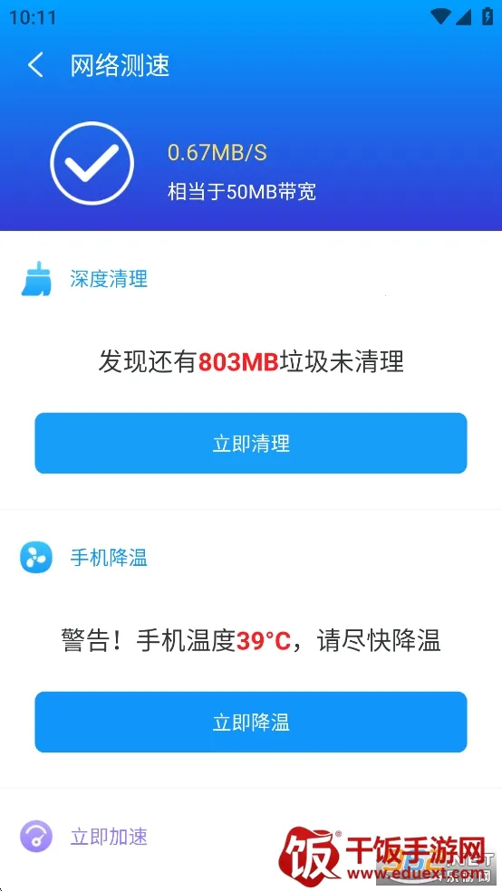 它的功能超实用。智能信号优化能自动切换最佳信道,提升覆盖范围和稳定性;一键加速可清理后台占带宽应用,实测提升网速20%-50%;网络测速能准确显示上传、下载速度和网络延迟;安全测试可检测WiFi是否被蹭网及安全隐患;深度清理能释放手机存储空间;手机降温可自动提醒并一键降温;一键省电能延长电池续航。有了它,就能告别网络卡顿和手机高温等情况,轻松享受清爽流畅的移动新体验,赶紧下载试试吧!