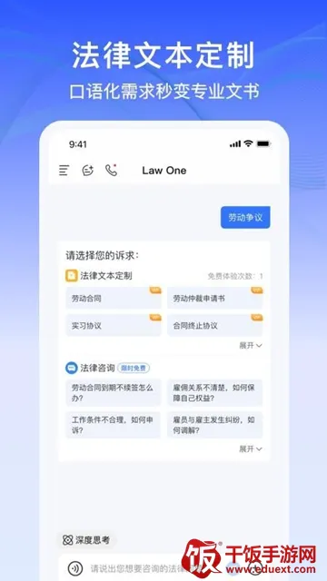 LawOne安卓免费版是为法律行业用户打造的一站式智能法律服务软件。能全天候服务,涵盖多领域。操作简单,可智能匹配律师,满足多场景咨询需求,还能定制合同、上传文件,有多种核心功能及更新内容。