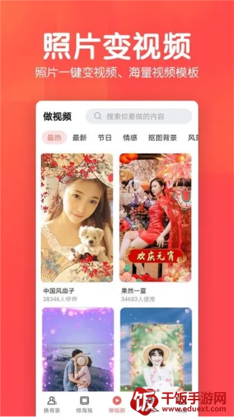 3. 视频制作轻松:海量视频模板一键制作照片视频,搭配视频滤镜和背景音乐,免去找素材的烦恼,让照片轻松动起来。