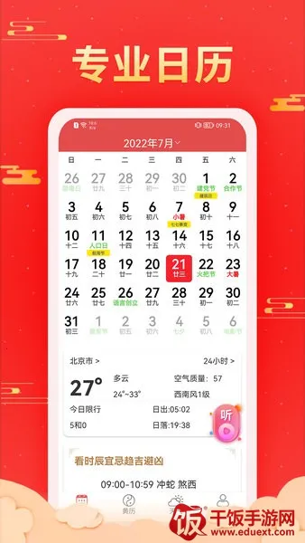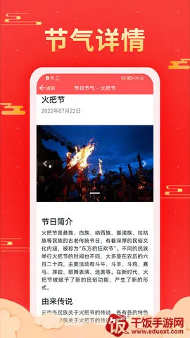 3、丰富的节日节气知识介绍,加深用户对中国传统文化的理解,详细罗列出农历节气变化、每日宜忌、吉神凶神等信息。