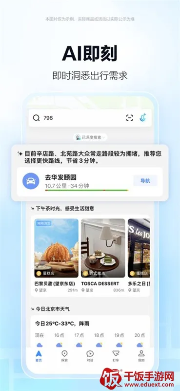 4. 精准搜索与关联:支持目的地精准搜索,关联周边餐饮、加油站、停车场等实用地点点位,满足出行延伸需求。