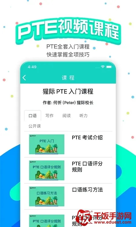 3、视频课程丰富:包含猩际PTE Peter校长亲自录制的入门课程,能快速掌握考试技巧,帮助雅思或托福转考PTE的考生清晰判别区别与优势。