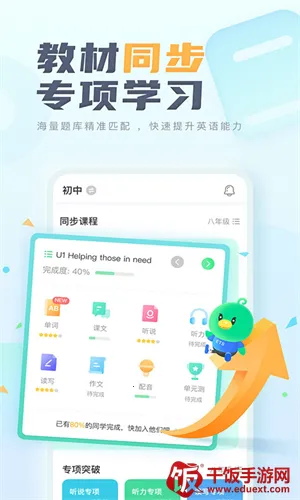 4. 功能多样:从音标学习到课文阅读、听说读写同步训练,还有专项训练、智能作文批改、作业平台等,全面提升英语能力。