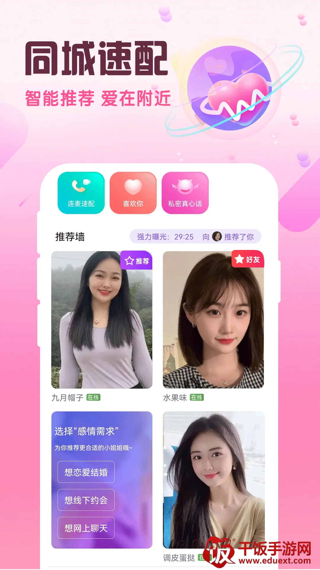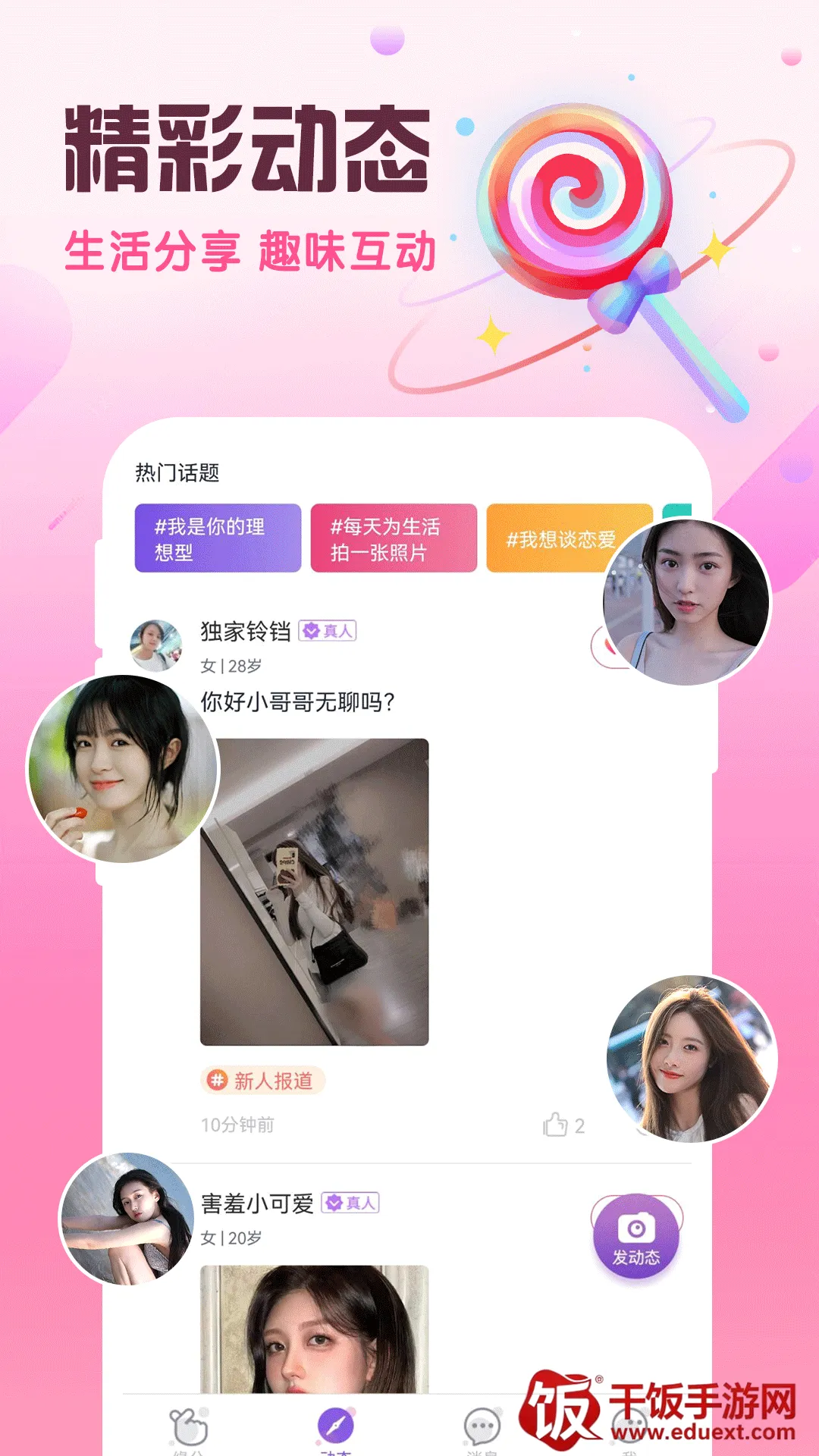 这是一款备受关注的交友软件。它以语音视频聊天为基础,能轻松缩短彼此距离,让用户随时随地聊天。在这里,用户可自由进行聊天服务,不必担心各种问题,社交变得更加方便。还有超多用户能直接一对一视频互动,迅速增进双方感情。软件提供了许多有趣的社交新玩法,能让用户更好地展现真实的自己。所有用户均经过实名认证,安全可靠,使用起来十分放心,可以畅所欲言。不管多活跃,都能轻松结交更多好朋友。而且各种有趣话题和圈子可免费加入,能与朋友及喜欢的异性语音聊天,带来不同社交体验,确实是一款值得尝试的交友软件。