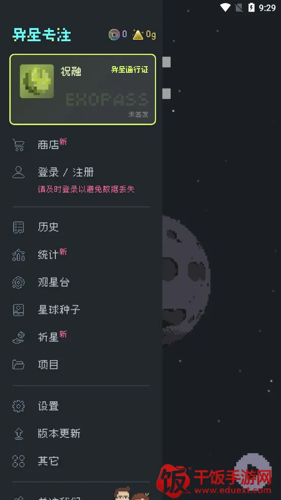 异星专注是一款独特的专注计时应用。它打破传统,以独创的游戏化设计,让专注过程趣味十足。每一次专注都能影响虚拟星球演化,赋予专注全新意义。其像素风格画面精美,多种专注模式适配不同需求,数据统计功能强大,能助你清晰了解专注情况。在这里,专注不再枯燥,而是充满惊喜与挑战。通过影响星球命运,你能收获前所未有的成就感。无论是学生党、上班族还是拖延症患者,都能在异星专注中找到适合自己的专注方式,开启奇妙的专注之旅,见证星球从荒芜到繁荣,绝对值得一试。