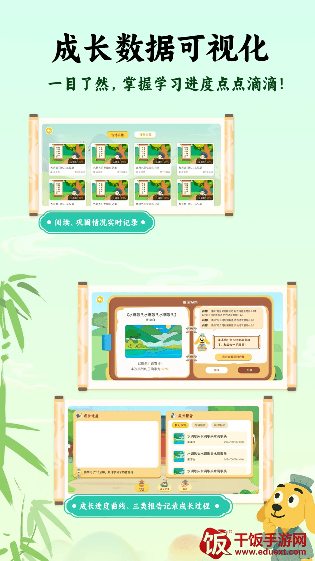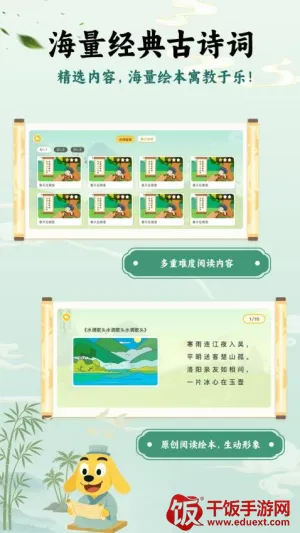 软件特色丰富,海量资源汇集众多古诗词,满足不同阅读需求;科学分级适配不同难度,便于轻松阅读;能助力高效巩固,可视化数据让学习曲线清晰可见;读练科学结合,深入赏析趣味十足。
