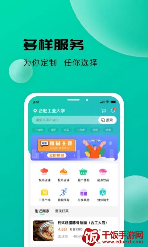 1. 优质外卖服务:平台收录海量美食商铺,学校周边美食全覆盖,各美食店均可点外卖配送。
