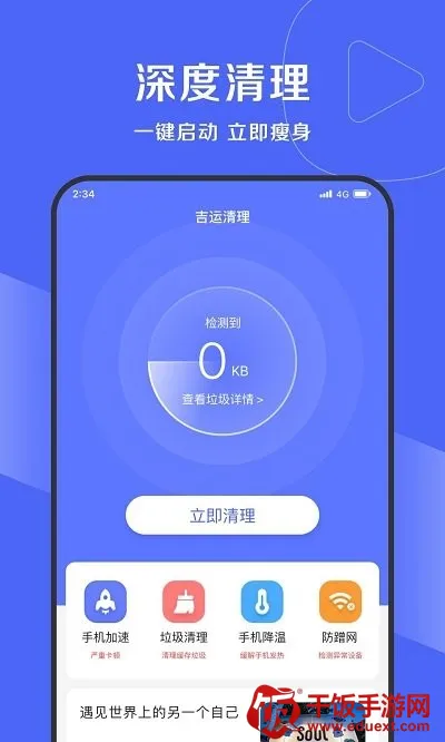 吉运清理是一款手机清理软件,功能强大。能清理内存垃圾,一键加速提运行速度,保护手机安全。免费且操作便捷,打开应用,点击一键加速或扫描垃圾按钮,即可清理缓存、历史记录等垃圾文件,释放空间。