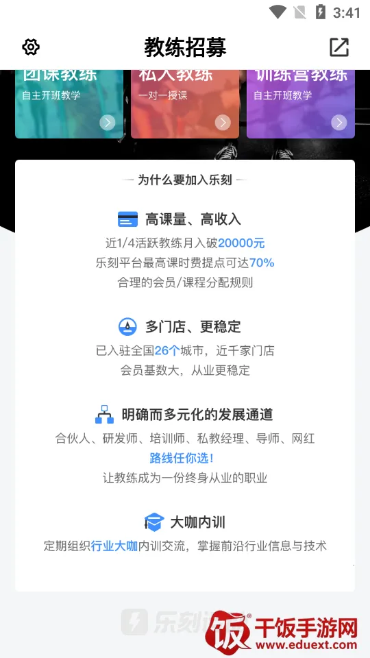 软件功能超丰富,课程管理方便你随时登记课程信息;学员管理可一键查看学员学习情况,系统智能分析生成数据图表;收入统计让你实时掌握收入状况。还有完善的教练成长体系助你成为专业教练,众多海报模板供你宣传自己。申请成为教练也不难,打开软件登录账号勾选同意相关协议,登录后会有教练招募广告,选其一填写个人信息,等待平台审核,审核通过后参加面试,按流程就能成为乐刻教练啦。