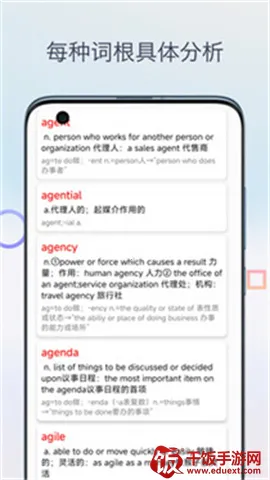 英语词根词缀字典是实用英语学习工具,覆盖词根词缀,有详细分析与独特功能。界面极简,按词根分类助记单词,提供多种复习方式,还能离线使用,结合科学理论,让学习高效有趣。