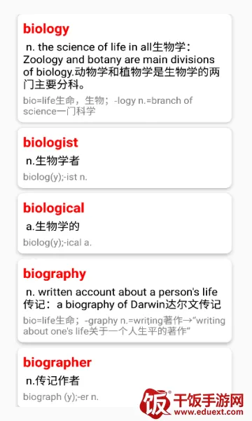 如果你想全面掌握英语词根词缀,那这款软件绝对是你的不二之选!它完整覆盖了各种词根词缀,一个都不会遗漏。每种词根都有详细分析,能让你透彻理解其本质。独特的词根分析功能,能够轻松分解每个单词,让你记忆起来事半功倍。软件界面设计极简,一切围绕学习展开。它可以根据词根分类帮你快速记忆单词,还有相关权威例句让你过目不忘。提供多种复习单词的方式,比如速查表、识别测试、听力记忆、听写练习等。通过学习词根词缀,能帮你掌握更多词汇,提高阅读和写作能力。精心设计的检索功能,支持按字母顺序、主题分类或直接输入关键词,快速找到你想学的内容。每个词条都有实用例句,让你在真实语境中学会灵活运用词汇。结合艾宾浩斯遗忘曲线的记忆卡片,帮你定期复习,稳固记忆。内置多样练习题,测试你的学习掌握程度,巩固知识。还能下载资料包Offline使用,随时随地学习,毫无压力。有了它,轻松搞定英语词根词缀学习!