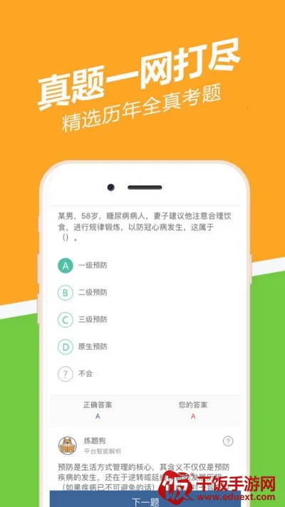 健康管理师练题狗2026官方正版具有诸多核心特色。它拥有雄厚师资力量,众多资深讲师即时答疑。题库资源免费开放海量题目,涵盖常见题型,降低备考成本。笔记功能实用,能随时标记重点便于强化记忆。学习社区活跃,可分享心得促进学习。考点分类训练,依大纲建体系,能针对性练习。每题配备名师视频与文字解析,助考生透彻理解考点。全免费学习平台,章节练习、模拟考试及真题资源完整开放。还能同步考试动态,让考生把握复习方向。