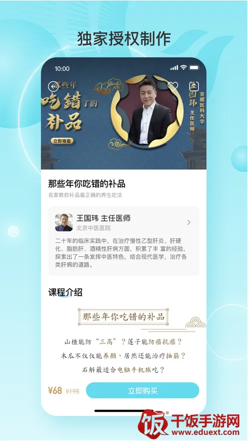 2、独家名医课:由100位国内知名医学专家独家授权制作的精品课程,为您带来专业深度的健康知识讲解,助力健康管理。