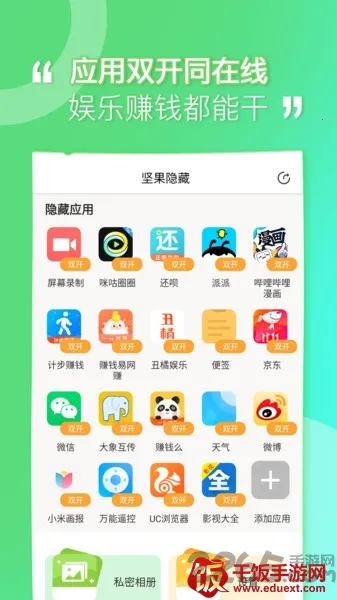 坚果隐藏2026下载安装具有诸多核心特色。它拥有世界领先的应用隐藏技术,能完美隐藏手机应用,让不想被他人看到的应用彻底隐匿。完善的通知隐藏方案,可使应用完全从手机消失,避免踪迹暴露。自带安全锁,有效保证他人无法窥探隐私。其隐私相册能轻松保存隐私照片,杜绝隐私泄露风险。还支持应用数据备份与恢复,文件加密、云储存等功能也一应俱全,为用户提供全面且强大的隐私保护,全方位守护个人信息安全。