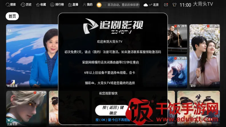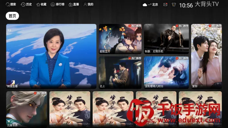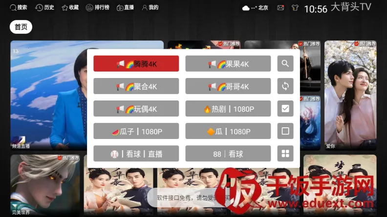 大背头 TV 是基于 TVBox 二次开发的多仓版电视双播神器。它**影视资源丰富**,涵盖电视、电影、综艺、动漫、美剧、韩剧等,海内外热播院线电影和好莱坞大片也有。界面简洁,体积小巧,无需注册登录,无广告干扰。高清画质能秒加载秒播放,带来极致看剧体验。还具备基础设置和高级设置功能,可修改软件壁纸、清缓存、改主页显示界面,以及调整播放设置、弹幕显示设置等。无论是追剧还是看电影,它都能满足需求,是家庭娱乐的理想之选。