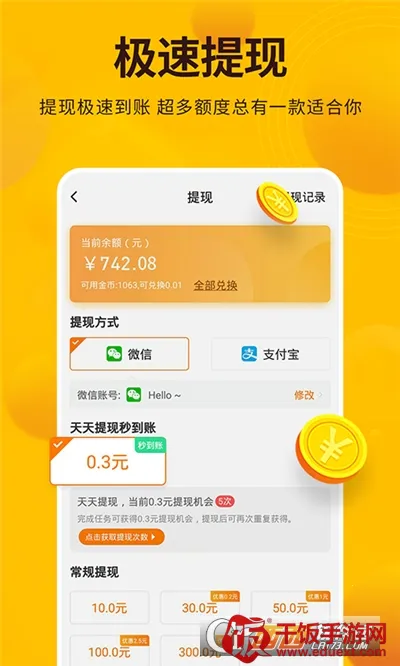 提现方便快捷:支持多种提现方式,满1元即可提现,且实时到账,让用户轻松获取收益。