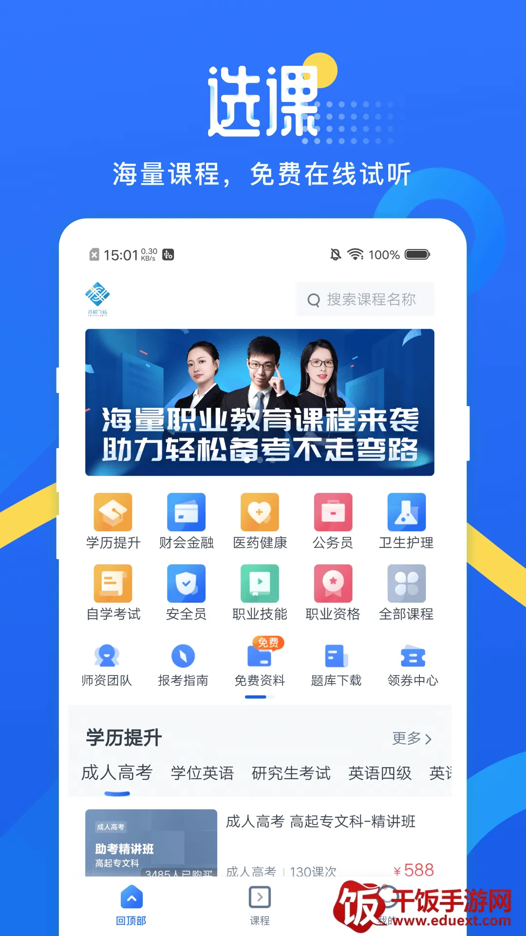 1、方向齐全,按需选择:学习首页提供多类目入口,支持快速切换学习目标,按照专业考试类别挑课更省心。