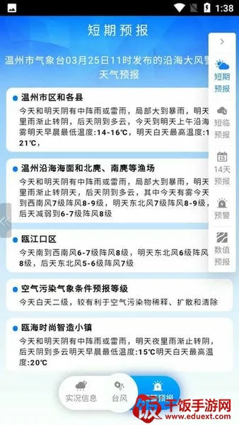 温州市台风网 2026 官方正版是温州市气象局打造的气象服务软件。提供精准台风监测预警,整合官方数据,追踪台风路径,支持 7 天预测与历史回溯,覆盖东南沿海。有多种特色功能与亮点优势,助用户防灾决策。