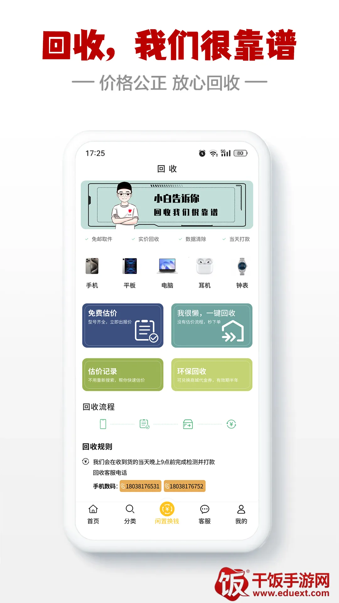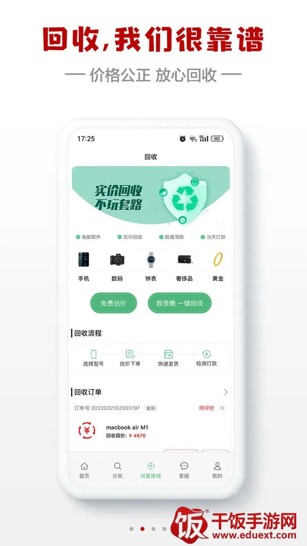 2. 回收价格高价且靠谱:拥有顶尖的二手手机回收测价系统,能为手机数码、奢品手表等提供真实估价,不套路,真实描述不手刀,保证用户能获得合理高价。