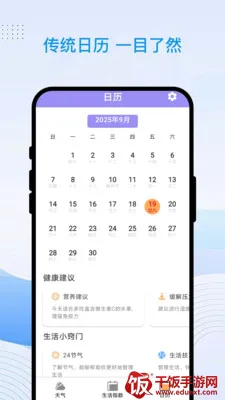 3.接着点下【日历】,能看到当天的新历及农历日期,还有很多健康建议与生活窍门。