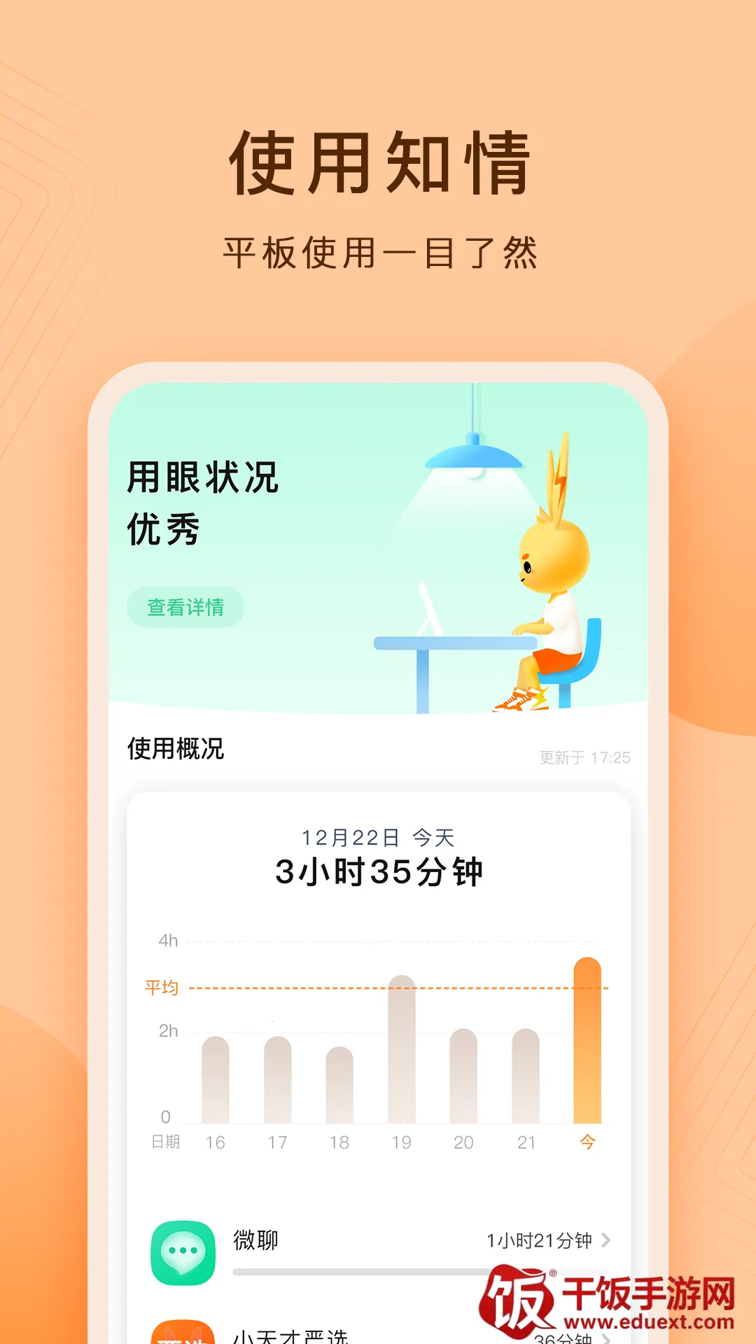 护眼平板APP是小天才护眼平板手机端配套软件,能让家长了解孩子用眼习惯、使用时长等,可管控应用下载与上网,支持微聊,还能自动禁用违规应用,全方位守护孩子健康使用平板。