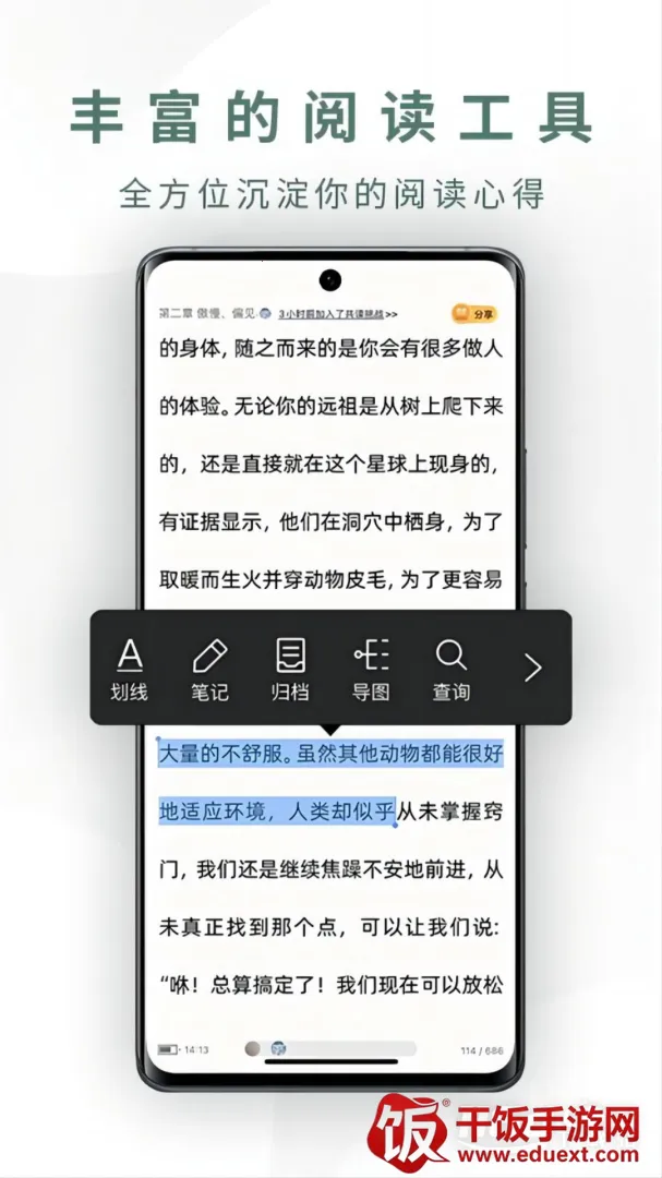 2. 多样阅读体验:具备多种阅读辅助功能,如字体切换、笔记导出、朗读模式等,还有划线、笔记归档、导图查询等,助您深入理解书籍。