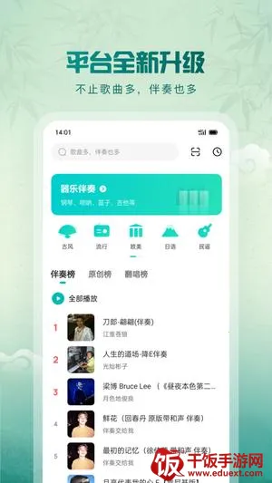 1. 海量音乐资源:汇聚流行、古典、民谣、古风等海量风格音乐及歌曲,还有不同版本伴奏,一键搜索轻松找到想听的,满足多样音乐需求。