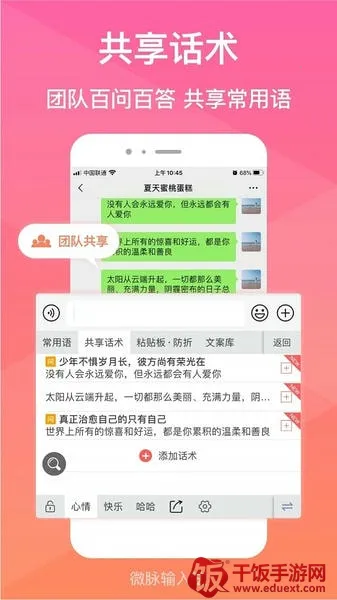 微脉输入法是一款专为微商打造的手机输入法,在微商群体中拥有超高人气,超过4500万微商用户的选择足以证明它的受欢迎程度。它能设置微商常用语,支持九宫格和语音转文字输入,贴合微商输入习惯,还能像正常输入法一样使用。