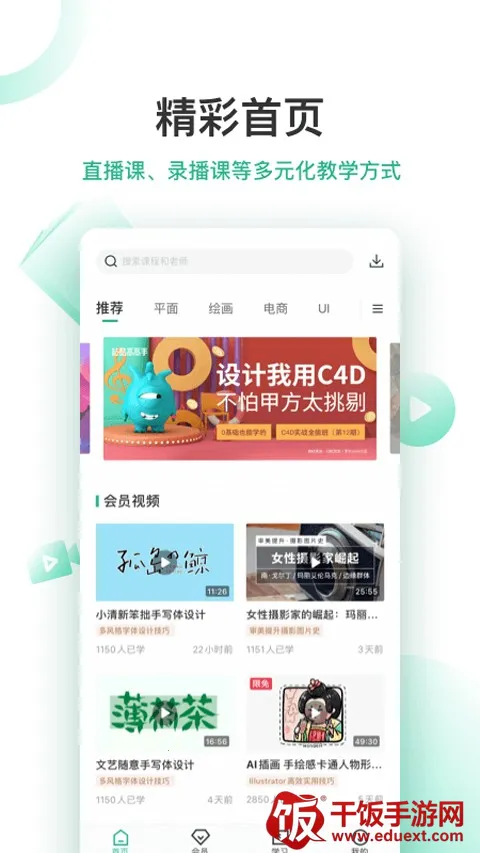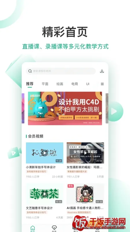 其优势众多。精选优质课程,知识点经精心梳理,干货满满助力提升;汇聚各艺术领域大师,助力突破学习瓶颈实现自我进阶;与众多学习者同伴而行,交流互动营造良好氛围共同成长进步。而且软件操作简单,新手小白也能轻松上手。无论是零基础的设计爱好者,还是亟待入行的设计新人,亦或是自驱进阶的资深设计师,都能在这里找到适合自己的课程,提升职业竞争力,是一款非常不错的艺术设计学习软件。